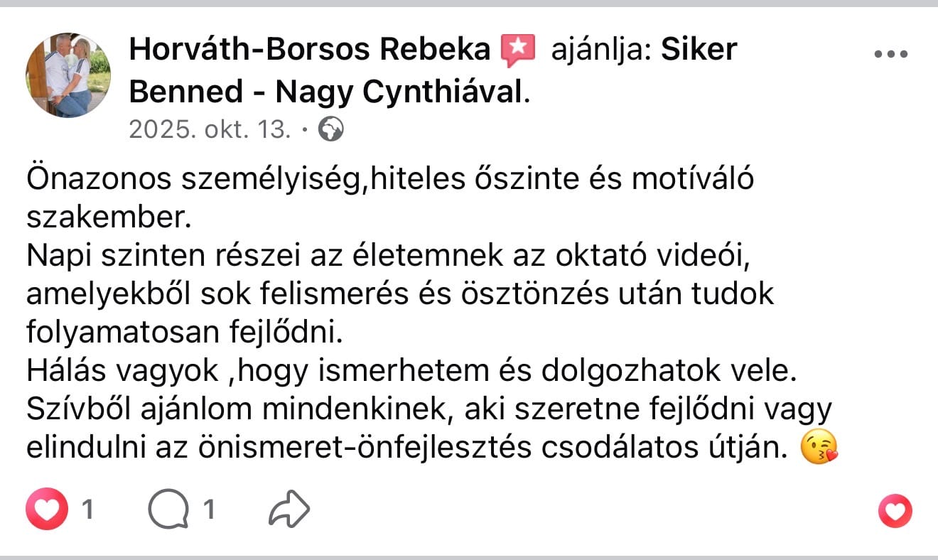 "Cynthia nagyon gyorsan és hatékonyan , megteremtette azt a biztonságos közeget , ahol hatékonyan tudunk fejlődni dolgozni . Pozitív , kedves , könnyed , támogató, és mindeközben valós belső munkára sarkall."